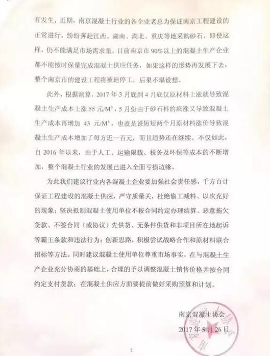 根據(jù)南京混凝土協(xié)會的測算,2017年3月底到4月底,僅原材料的價格上漲就導致混凝土生產(chǎn)成本上漲了55元/方,5月份由于砂石料的瘋漲又導致混凝土生產(chǎn)成本再次增加43元/方,換言之,短短兩個月原材料漲價就導致混凝土生產(chǎn)成本增加了每方近100元,且上漲趨勢還在繼續(xù)。不僅如此,自2016年以來,由于人工、運輸限載、稅務及環(huán)保等成本的不斷增加,整個混凝土行業(yè)的發(fā)展已全面進入虧損邊緣。