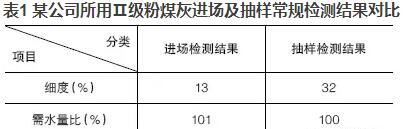 優(yōu)質的粉煤灰摻入混凝土可明顯地改善混凝土的和易性,當粉煤灰摻量大于膠材總量的5%~10%時,效果極為明顯?,F今在混凝土實際生產中,粉煤灰摻量往往達到20%,有的甚至高達30%,但混凝土的和易性卻不盡人意。抽取原材料進行檢測時,發(fā)現粉煤灰的檢測結果經常不滿足標準要求或者與驗收時的結果相差甚遠?,F以某公司所用Ⅱ級粉煤灰進場及抽樣常規(guī)檢測結果進行對比,見表1。