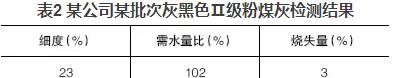 混凝土公司大多數使用的粉煤灰顏色與水泥相近,多呈灰色;也有部分粉煤灰顏色較深呈灰黑色,這種粉煤灰一般細度較細或含碳量較高。但總會發(fā)現一些深顏色的粉煤灰檢測結果與常理不符,如某公司某批次灰黑色Ⅱ級粉煤灰檢測結果見表2。