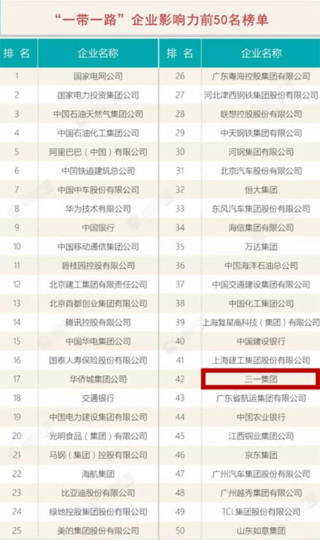 近日,國家信息中心發(fā)布了《”一帶一路”大數(shù)據(jù)報告(2017)》,首次評選出“一帶一路”企業(yè)影響力50強榜單,三一集團排名第42位。