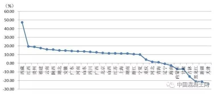 從各地區(qū)建筑業(yè)總產(chǎn)值增長情況看,有23個地區(qū)的建筑業(yè)總產(chǎn)值較上年同期有不同幅度的增長。其中,西藏、江西、貴州、福建、云南、陜西的增幅均超過15%。有8個地區(qū)出現(xiàn)負(fù)增長,其中,天津、新疆、黑龍江、吉林出現(xiàn)了15%以上的負(fù)增長(圖2)。