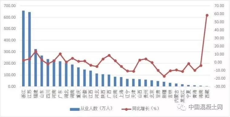 2018年上半年,全國建筑業(yè)從業(yè)人數(shù)超過百萬的地區(qū)共15個。浙江、江蘇依然是從業(yè)人數(shù)大省,人數(shù)分別達(dá)到658.04萬人和643.60萬人。福建、山東、四川、河南、廣東、湖北等6省從業(yè)人數(shù)均超過200萬人。與上年同期相比,16個地區(qū)的從業(yè)人數(shù)增加,其中,增加人數(shù)最多的是福建,增加38.15萬人;15個地區(qū)的從業(yè)人數(shù)減少,其中,減少最多的是新疆,減少8.76萬人。從業(yè)人數(shù)增幅最大的是西藏,達(dá)到58.09%;增幅最小的是新疆,下降了17.44%(圖5)。