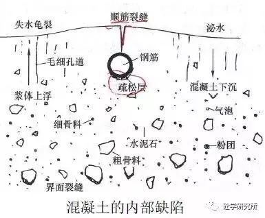 混凝土拌合物在攪拌后混合均勻,骨料下沉,混凝土中的游離水和輕物質(zhì)上浮、氣泡逸出,泌出的水分在混凝土表面聚集,這是混凝土拌合物的保水性(粘聚性)不好,這個過程會在混凝土內(nèi)部形成較多的缺陷,如: