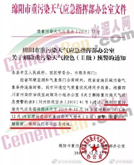 同期,四川省綿陽市重污染天氣應急指揮部辦公室發(fā)布了《關于解除重污染天氣橙色(II級)預警的通知》稱,綿陽市重污染天氣應急指揮部定于2019年12月26日零時解除2019年12月19日零時啟動的重污染天氣橙色(II級)預警,預警正是解除前,繼續(xù)執(zhí)行各項應急措施。通知原文如下: