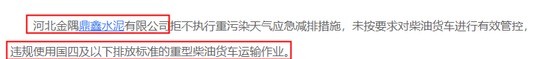 此外,今年10月河北金隅鼎鑫水泥有限公司拒不執(zhí)行重污染天氣應(yīng)急減排措施,未按要求對柴油貨車進(jìn)行有效管控,違規(guī)使用國四及以下排放標(biāo)準(zhǔn)的重型柴油貨車運輸作業(yè),被當(dāng)?shù)丨h(huán)保部門通報。