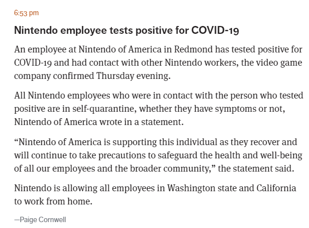 根據(jù)《西雅圖時報》的相關(guān)報道,美國任天堂一名員工目前已經(jīng)出現(xiàn)“新冠病毒檢測陽性”的狀況,目前,與這位員工有過接觸的其他人員已經(jīng)開始自我隔離?!段餮艌D時報》報道原文: