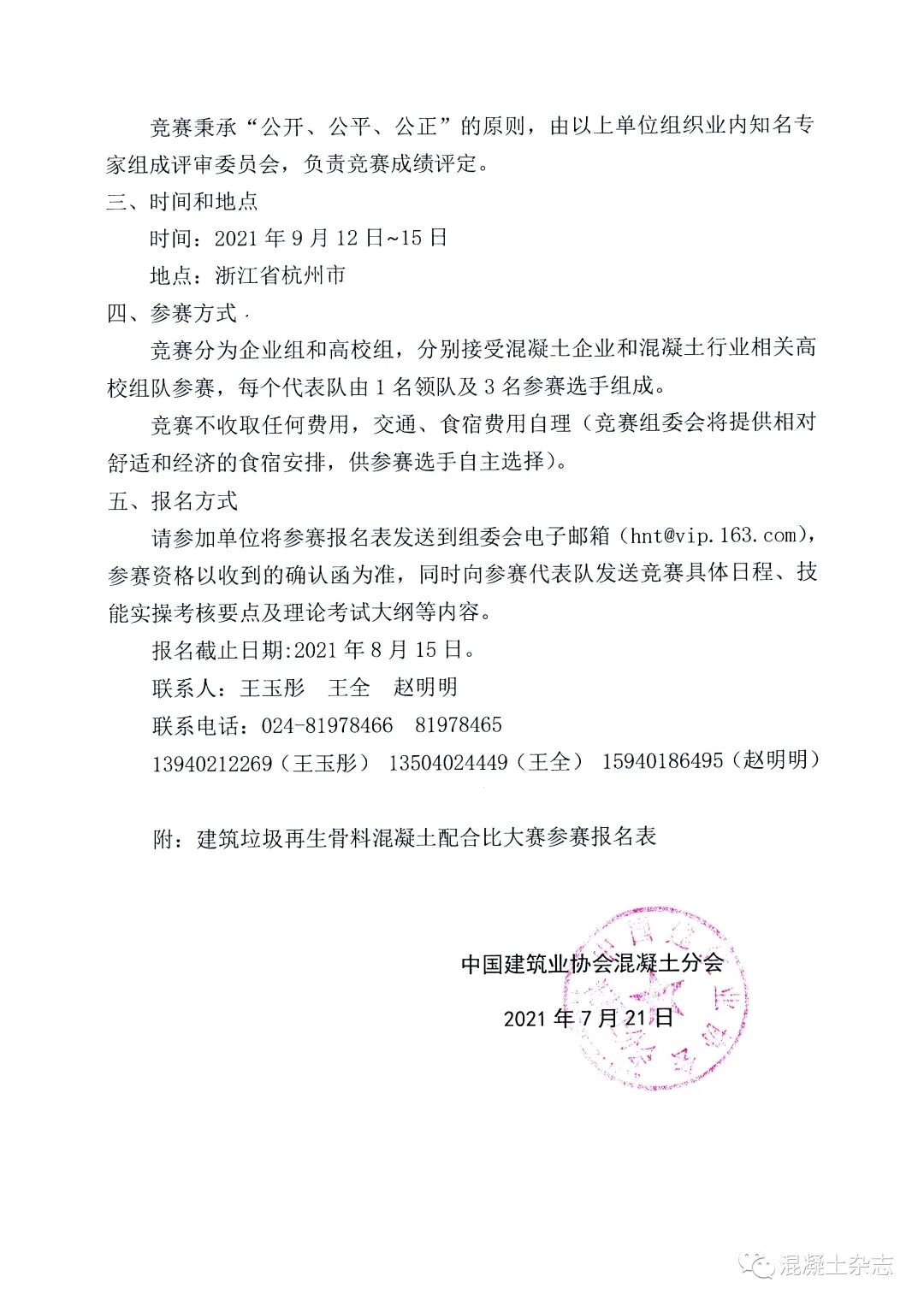 為配合《住房和城鄉(xiāng)建設(shè)部關(guān)于推進(jìn)建筑垃圾減量化的指導(dǎo)意見》(建質(zhì)〔2020〕46號)的發(fā)布,進(jìn)一步推動混凝土行業(yè)建筑垃圾消納和碳減排,為我國2030年前實現(xiàn)碳達(dá)峰、2060年前實現(xiàn)碳中和的目標(biāo)做出混凝土行業(yè)的貢獻(xiàn),現(xiàn)決定于2021年9月12日~15日于浙江省杭州市舉辦建筑垃圾再生骨料混凝土配合比大賽。