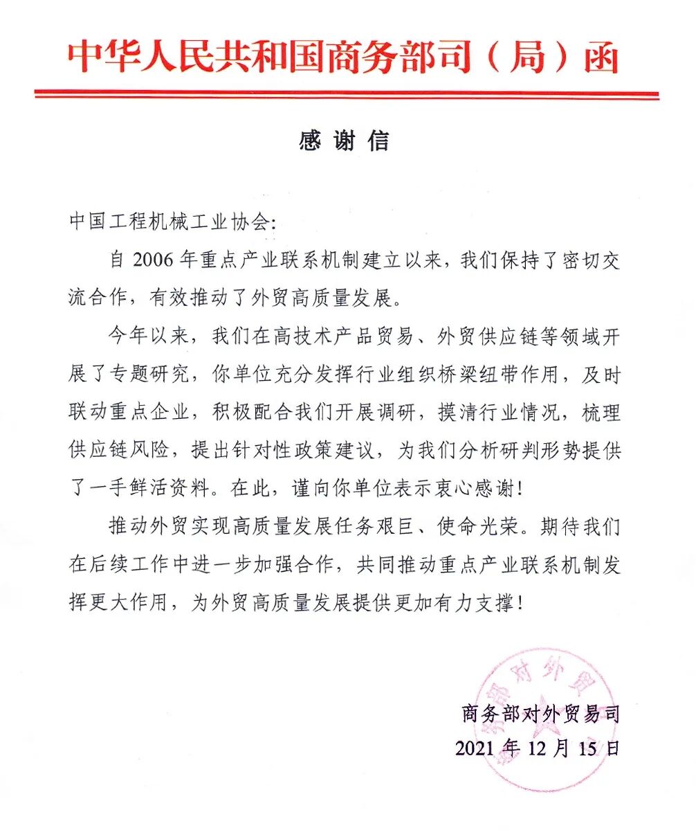 近日,商務(wù)部對(duì)外貿(mào)易司致函中國(guó)工程機(jī)械工業(yè)協(xié)會(huì),就協(xié)會(huì)今年以來(lái),積極配合商務(wù)部對(duì)外貿(mào)易司在高技術(shù)產(chǎn)品貿(mào)易、外貿(mào)供應(yīng)鏈等領(lǐng)域開(kāi)展了專(zhuān)題研究,收集、整理了大量的行業(yè)外貿(mào)進(jìn)出口情況,受到了高度的肯定。并指出,協(xié)會(huì)充分發(fā)揮行業(yè)組織橋梁紐帶作用,及時(shí)聯(lián)動(dòng)重點(diǎn)企業(yè),積極配合商務(wù)部對(duì)外貿(mào)易司開(kāi)展調(diào)研,摸清行業(yè)情況,梳理供應(yīng)鏈風(fēng)險(xiǎn),提出針對(duì)性政策建議,為商務(wù)部對(duì)外貿(mào)易司分析研判形勢(shì)提供了一手鮮活資料。在此,謹(jǐn)向協(xié)會(huì)表示衷心感謝!