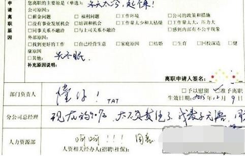 部門(mén)負(fù)責(zé)人回復(fù):“懂你,TAT”;分公司總經(jīng)理回復(fù):“現(xiàn)在的90后,太不負(fù)責(zé)任了,我表示無(wú)語(yǔ)。同意”;人力資源部回復(fù):“呵呵?。?!同意”。