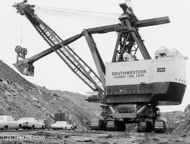 這個電鏟1965年問世,組裝它花了約兩年時間,最終的建造費用在當(dāng)時超過1500萬美元,在美國Southwestern Illinois的“Captain”露天煤礦使用,其高度相當(dāng)于21層樓,使用7000V的高壓電,行走裝置為8條履帶,斗臂長度為41米,最大挖掘高度67.2 m,是迄今全球最大的電鏟,因火災(zāi)毀損于1992年爆破拆解,一生的挖掘量達到6億2千萬方。沒有見證這一奇跡真是遺憾吶~