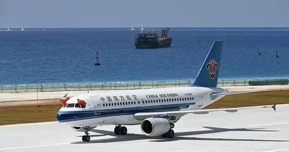 7月13日,中國南沙美濟礁渚碧礁新建機場試飛成功。