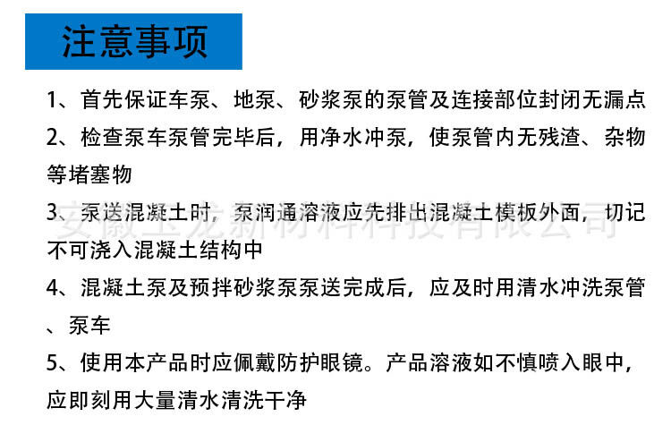 3、泵送混凝土?xí)r,泵潤(rùn)通溶液應(yīng)先排出混凝土模板外面,切記不可澆入混凝土結(jié)構(gòu)中;