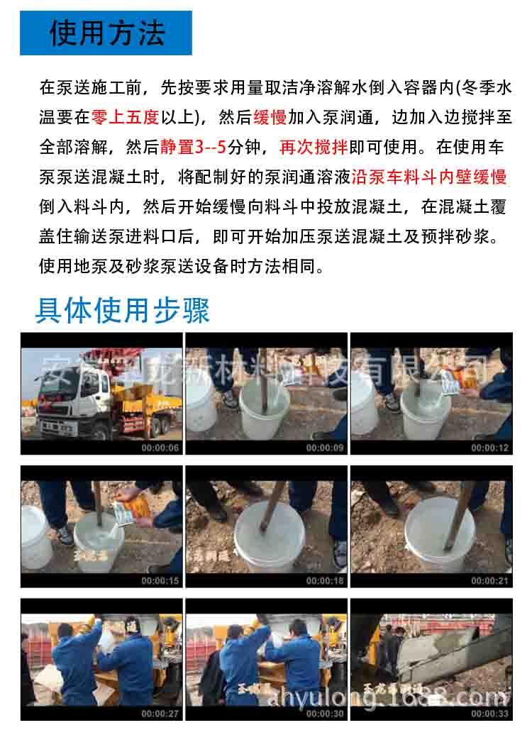 在泵送施工前,先按要求用量取潔凈溶解水倒入容器內(nèi),然后均勻緩慢的加入泵車潤(rùn)管劑(泵潤(rùn)通),邊加入邊攪拌至全部溶解,然后靜置3分鐘,再次攪拌即可使用。在使用車泵泵送混凝土?xí)r,將配制好的潤(rùn)管劑溶液沿泵車料斗內(nèi)壁緩慢倒入料斗內(nèi)并使之滿過(guò)泵管進(jìn)料口,然后開(kāi)始緩慢向料斗中投放混凝土,同時(shí)開(kāi)始加壓進(jìn)行混凝土及預(yù)拌砂漿泵送作業(yè)。使用地泵作業(yè)時(shí)方法相同,但應(yīng)注意適度調(diào)整產(chǎn)品及溶解水的用量。使用地泵時(shí),總長(zhǎng)度不得超過(guò)100米,如需超過(guò)100米地泵使用,則向公司購(gòu)買地泵專用泵潤(rùn)通。