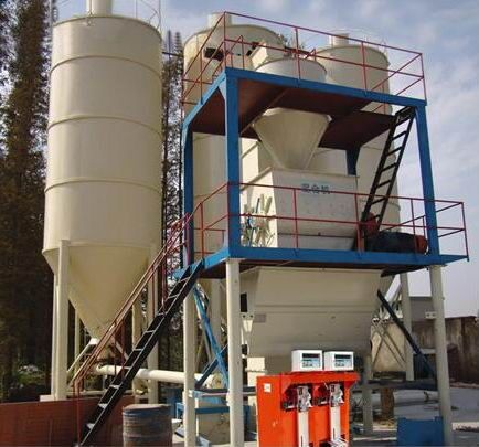 騰飛集團(tuán)膩?zhàn)臃凵a(chǎn)設(shè)備年產(chǎn)兩到三萬噸左右的膩?zhàn)臃凵a(chǎn)設(shè)備,一般情況下會(huì)用到4-6個(gè)原料罐,其中兩個(gè)大罐用于裝放散裝水泥和粉煤灰,其余小罐用于裝放輕鈣、 重鈣、砂、小料等。散裝水泥和粉煤灰進(jìn)罐不需要提升設(shè)備,依靠泵車打入。輕鈣、重鈣、砂、小料等需要使用斗式提升機(jī)提入小罐,巧妙的物料分配系統(tǒng)支持一個(gè)斗式提升機(jī)分配式作業(yè),從而避免了資源浪費(fèi)。