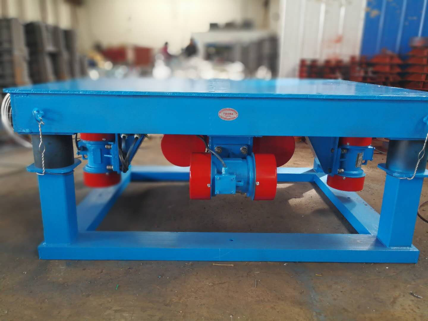 混凝土振動(dòng)臺(tái)主要由臺(tái)底架、振動(dòng)器彈簧等部件組成,臺(tái)面與底架均用鋼板和型鋼焊接而成,振動(dòng)臺(tái)是用電動(dòng)機(jī)加一對相同的偏心輪組成。并通過一對吊架聯(lián)軸器安裝在臺(tái)面(反面)中心位置,起著振實(shí)過程中平穩(wěn)、垂直方向的作用。本儀器專供實(shí)驗(yàn)室內(nèi)震實(shí)成型混凝土試件及制品之用。