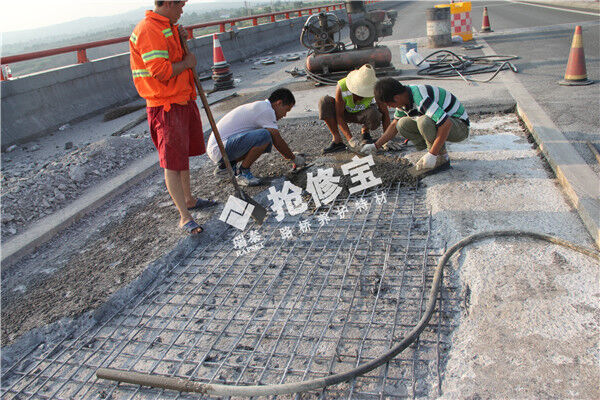 由于時間要求快,應(yīng)采用混凝土特種材料進(jìn)行搶修,路橋養(yǎng)護(hù)特材——搶修寶RT-2,30分鐘速凝,2小時可通行,早期強度高、后期強度不倒縮,粘結(jié)能力強,是治理橋梁路面鋪裝層病害常備的特種建材,采用風(fēng)鎬對鋪裝層病害進(jìn)行清除,破碎時注意水平方向分離鋪裝層與梁板,不能影響梁板的狀態(tài)和質(zhì)量,對梁板頂要清除整潔,用氣泵或高壓水對梁板頂進(jìn)行沖洗,不積水不滲漏的情況下,采用搶修寶RT-2特種水泥與標(biāo)準(zhǔn)石子按照要求配比,加水?dāng)嚢瑁杆贊沧⒌讲『Σ课唬ㄖ僚c路面齊平時,灑水量水進(jìn)行收光,指甲掐不動混凝土?xí)r進(jìn)行養(yǎng)護(hù),2小時后即可通行。避免大面積換板,降低了工程成本。施工無需動用大型機(jī)械,對交通安全影響不大。