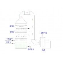 內(nèi)設(shè)逆向填料吸收系統(tǒng)、噴淋系統(tǒng)、脫霧裝置系統(tǒng)、下設(shè)供水箱、供水泵系統(tǒng)、進(jìn)出風(fēng)口、風(fēng)機(jī)、風(fēng)管、吸罩組成系統(tǒng)。