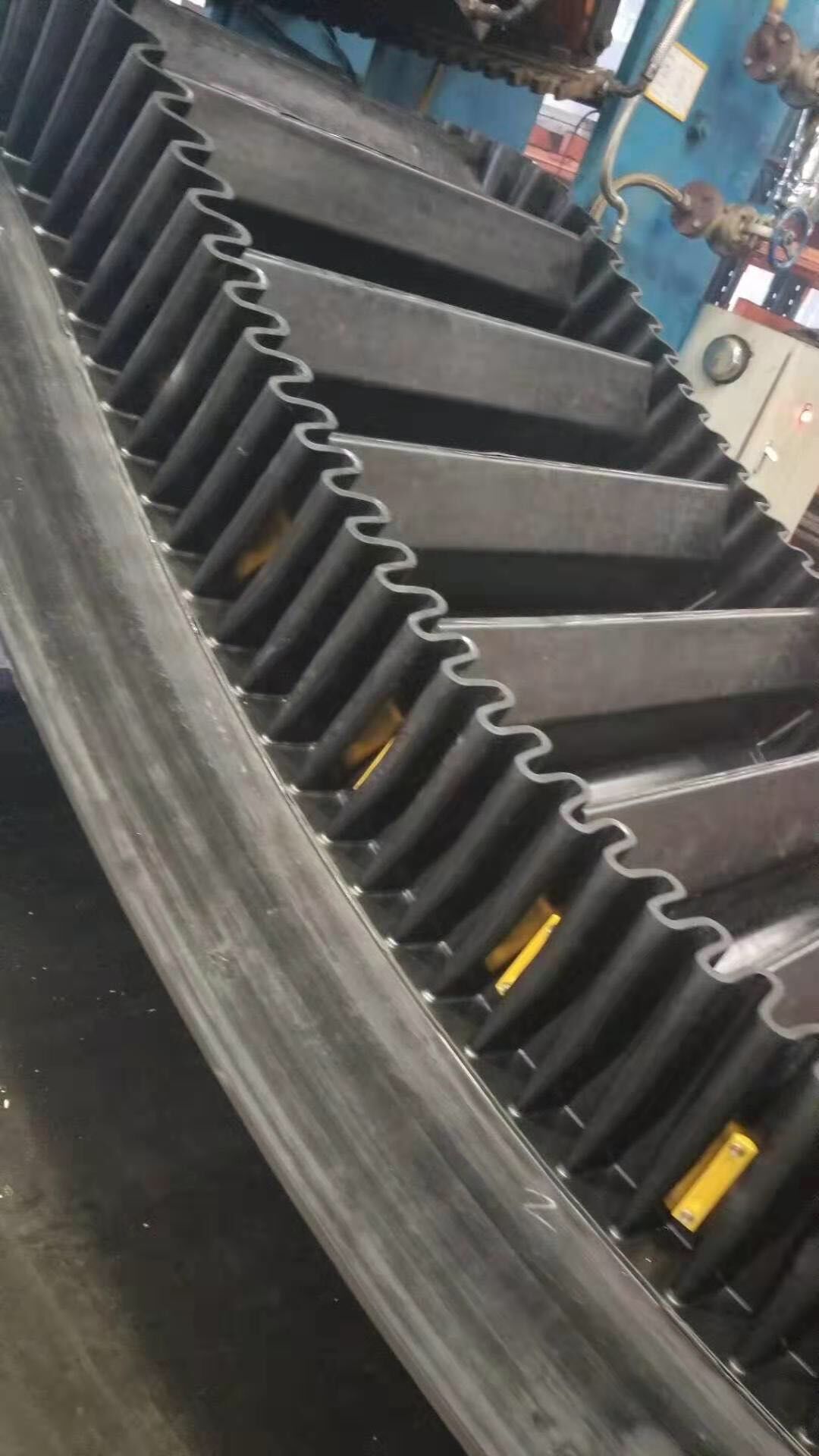 大傾角波狀擋邊帶由基帶、擋邊、橫隔板3部分組成。擋邊起防止物料測滑撒落的作用。為便于繞過滾筒,檔邊設(shè)計成波紋狀;橫隔板的作用是承托物料,為了實現(xiàn)大傾角輸送,采用TTC型。檔邊和橫隔板是用二次硫化的方法與基帶連接的,具有很高的連接強度。