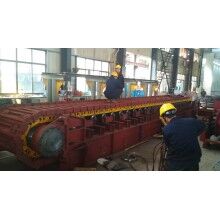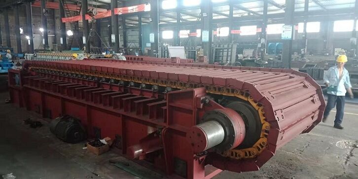 5、頭尾輪應(yīng)采用優(yōu)質(zhì)鑄鋼件并經(jīng)良好的熱處理,應(yīng)帶有張緊裝置。喂料倉(cāng)與板喂機(jī)之間應(yīng)設(shè)有溜槽,板喂機(jī)帶支架和支腿。