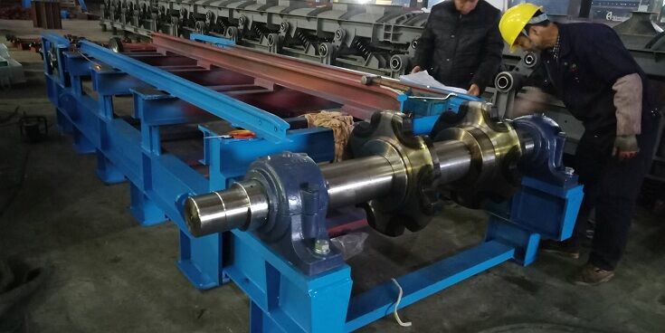 頭輪組裝有兩件主動鏈輪,與尾輪組相呼應(yīng),頭輪組做為主動輪組, 尾輪組為從動輪組。當(dāng)傳動機構(gòu)帶動頭輪轉(zhuǎn)動時,帶動輸送鏈條、刮板輸 送裝置運轉(zhuǎn),完成輸送料過程。