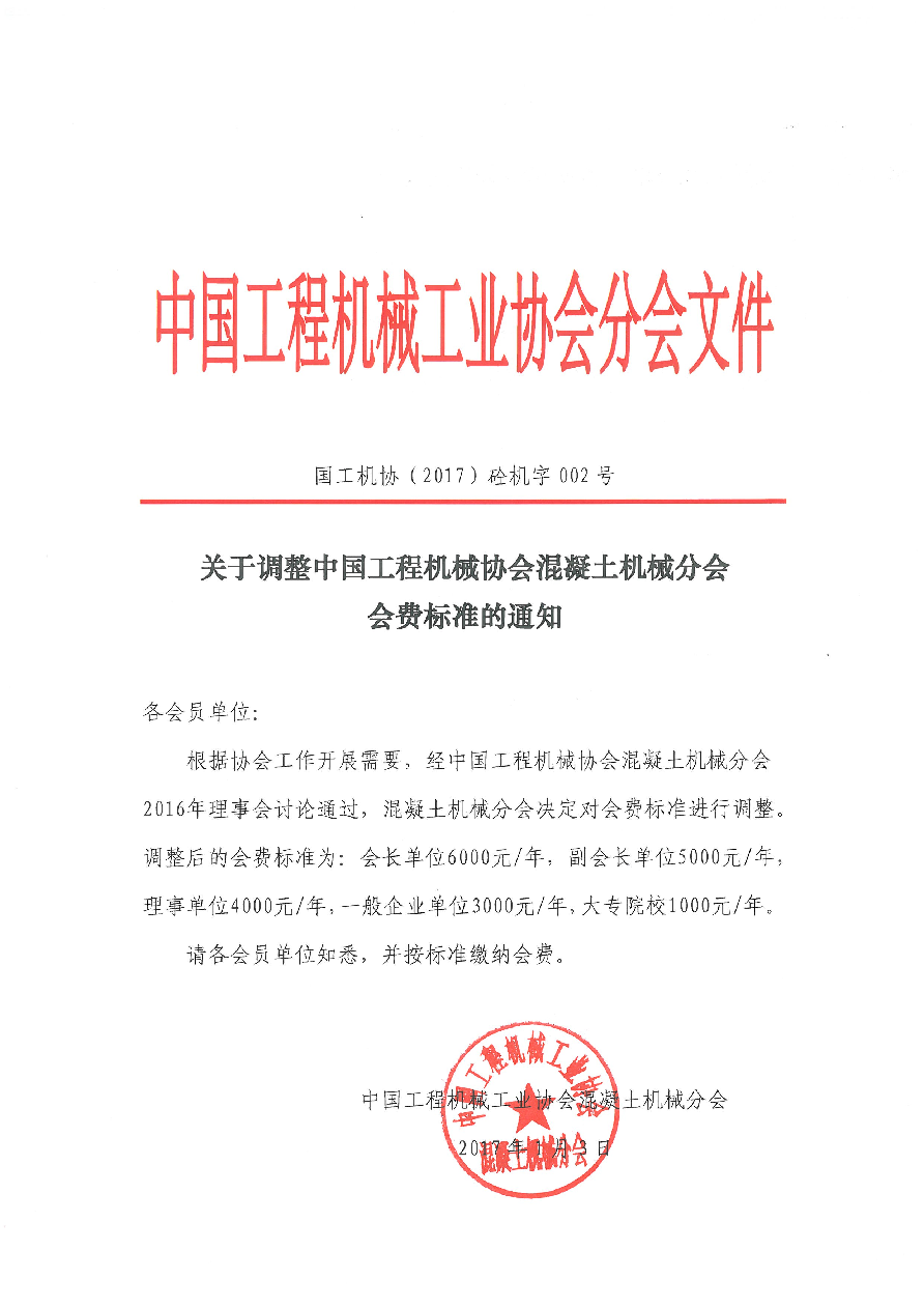 關(guān)于調(diào)整中國(guó)工程機(jī)械協(xié)會(huì)混凝土機(jī)械分會(huì)會(huì)費(fèi)標(biāo)準(zhǔn)的通知