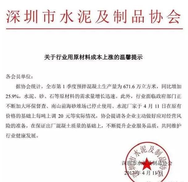 11日,深圳市水泥及制品協(xié)會(huì)發(fā)布關(guān)于行業(yè)用原材料成本上漲的提示,全市一季度預(yù)拌混凝土生產(chǎn)量為671.6萬立方米,同比增加25.9%,水泥、砂、石等原材料的需求量增長迅速。此外,行業(yè)面臨政府部門正不斷加大環(huán)保督查、南山前海砂堆場已停止使用、水泥廠家于4月11日在原有價(jià)格的基礎(chǔ)上每噸上調(diào)20元。