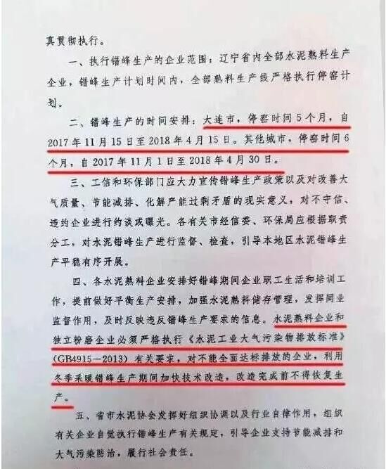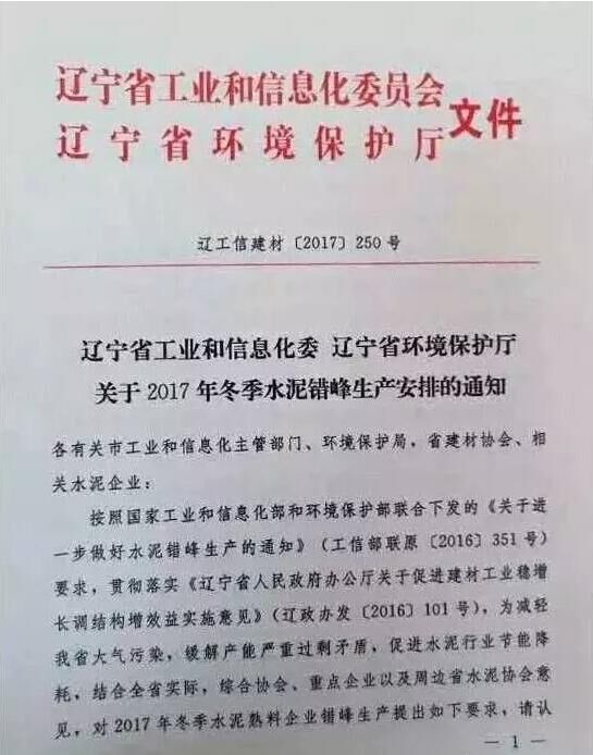 日前,遼寧省工信委和遼寧省環(huán)保廳聯(lián)合發(fā)文要求遼寧省水泥企業(yè)于今年11月開始啟動水泥行業(yè)采暖季錯峰停產計劃,除大連市以外的其他城市的全部水泥熟料生產企業(yè)錯峰停產6個月,錯峰生產自今年11月1日起停至明年春天4月末結束。