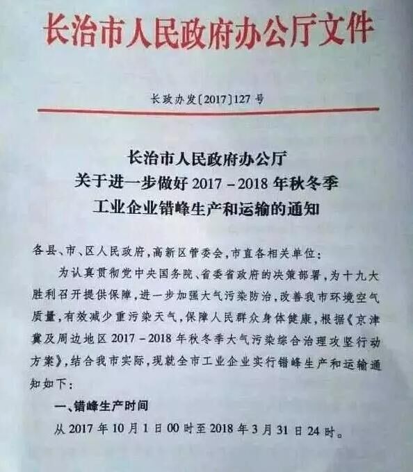 山西省長治市也發(fā)布《關于進一步做好2017-2018秋冬季工業(yè)企業(yè)錯峰生產和運輸?shù)耐ㄖ?。要求?017年10月1日00時起至2018年3月31日24時,水泥(含粉磨站)等建材行業(yè)企業(yè)全部停產。