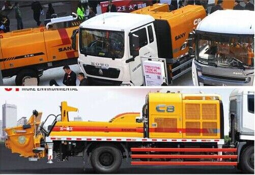 三一HOWO國(guó)Ⅳ排放標(biāo)準(zhǔn)單動(dòng)力車載泵(無上裝動(dòng)力)是bauma展覽會(huì)上展出的唯一一臺(tái)車載泵。配置單一動(dòng)力和進(jìn)口分動(dòng)箱,從而節(jié)約了一臺(tái)上裝泵送柴油發(fā)動(dòng)機(jī),是該車的最大亮點(diǎn)。該車載泵柴油機(jī)功率為206kW,6.87L排量,配置400L大油箱,混凝土理論輸送壓力10/20MPa,理論輸送量115/60m3/h。