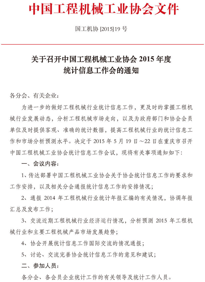 關(guān)于召開中國(guó)工程機(jī)械工業(yè)協(xié)會(huì)2015年度統(tǒng)計(jì)信息工作會(huì)的通知